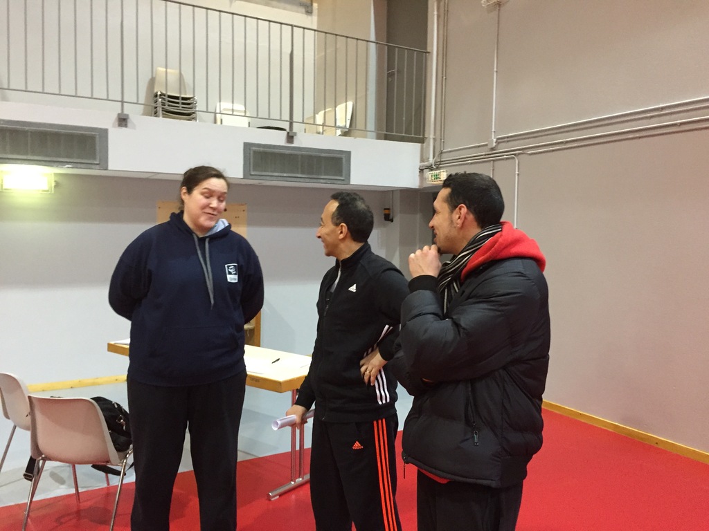 Après avoir définit de manière générale l'importance, les avantages et les limites de l'agressivité. Abdel met en place les filles pour l'échauffement : travail sur les appuis et les départs en dribble (ndlr : apprentissage du rocker step et du Jab step)
