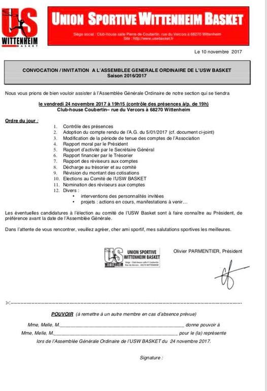 L’USW invite ses membres à participer à l’ASSEMBLÉE GÉNÉRALE ORDINAIRE -Saison 2016/2017- le vendredi 24 novembre 2017 à 19h15 au club house de la salle Pierre de Coubertin, rue du vercors à Wittenheim.